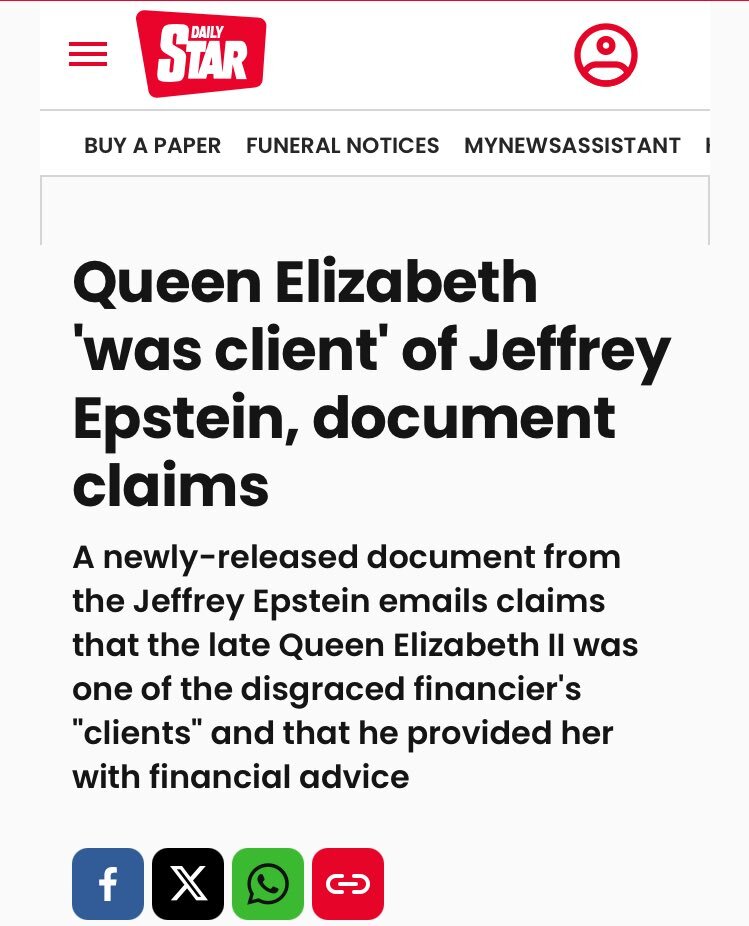 Queen Elizabeth 'was client' of Jeffrey Epstein, document claims - Daily Star dailystar.co.uk/news/latest-ne…