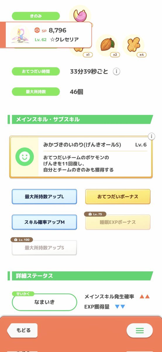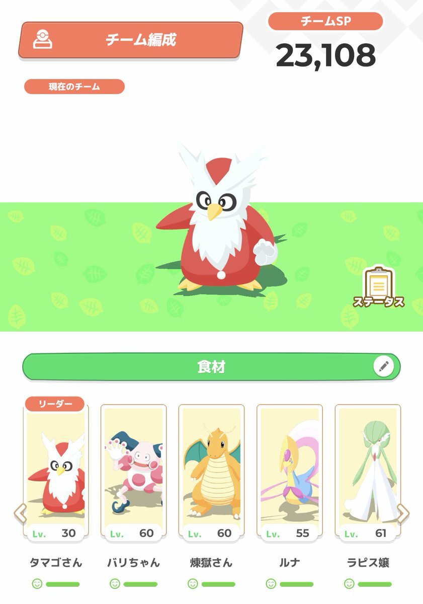 返信先:@Ra91Ra93クレセリアパを意識してるから育成は1体でいいかなって感じ 食材構成も同じだし🤣