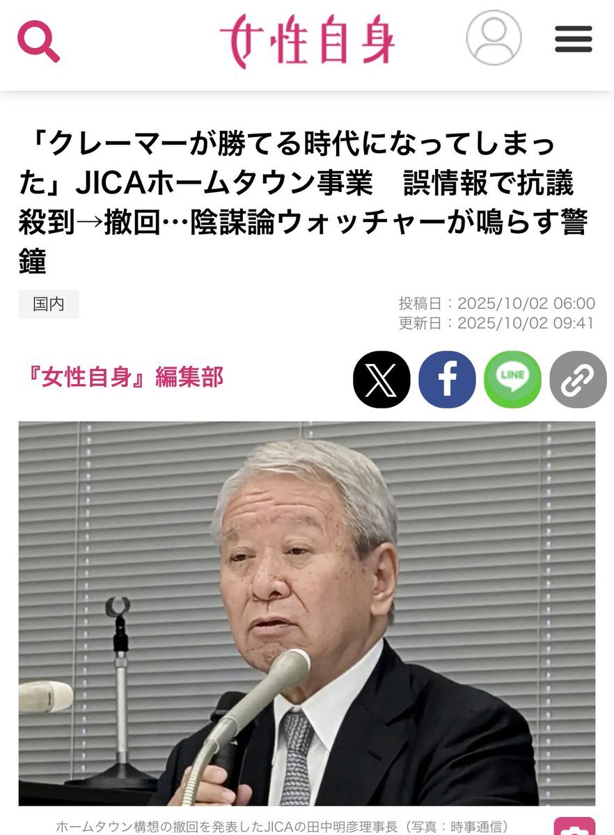 JICAの田中明彦、日本を憂慮する国民をクレーマー扱い 血税をばら撒く国賊組織 「クレーマーが勝てる時代になってしまった」JICAホームタウン事業 誤情報で抗議殺到→撤回…陰謀論ウォッチャーが鳴らす警鐘 | 女性自身 jisin.jp/domestic/25216…