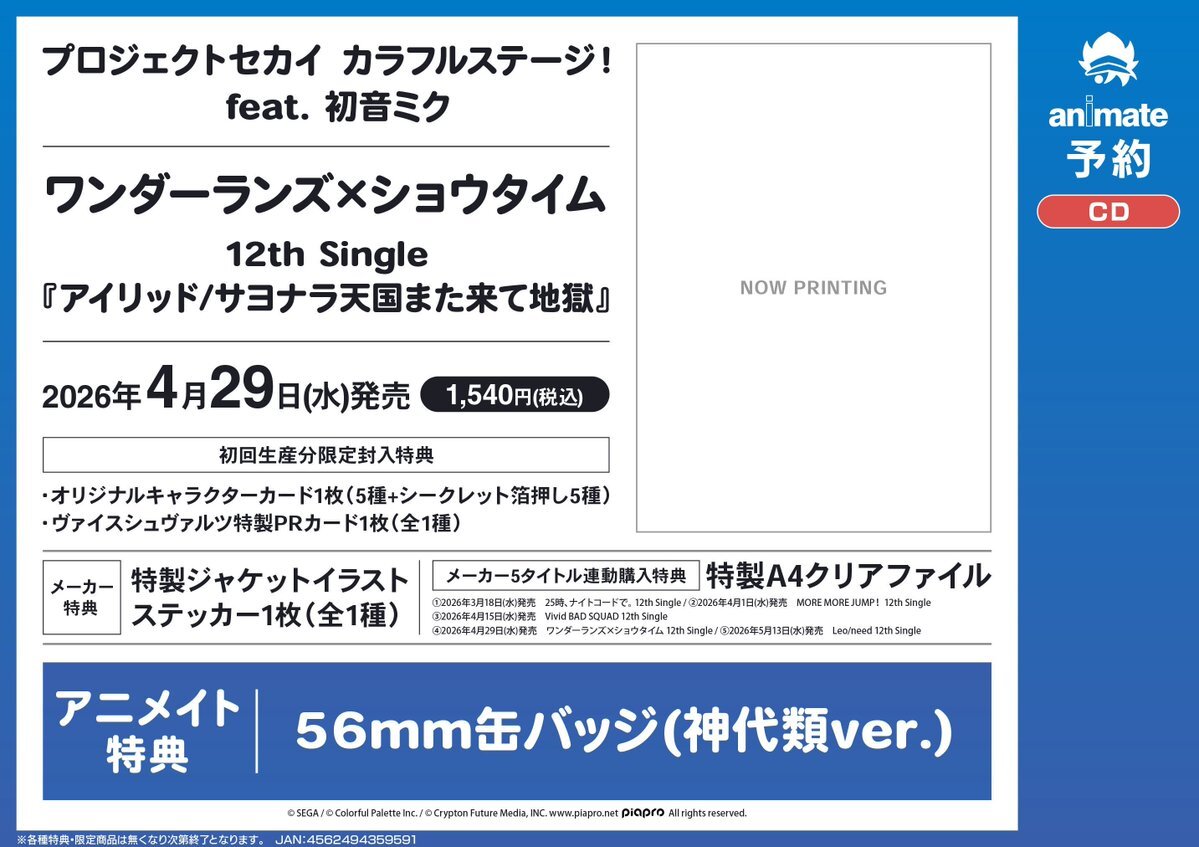 【CD予約情報】#プロセカ #ワンダショ 2026/04/29 発売 プロジェクトセカイ カラフルステージ! feat.初音ミク ワンダーランズ×ショウタイム「アイリッド/サヨナラ天国また来て地獄」 ⇒animate-onlineshop.jp/pd/3317914/?ut… #アニメイト特典(神代類 ver.) ★缶バッジ メーカー特典 ★ステッカー pic.x.com/mU23Srqjjb