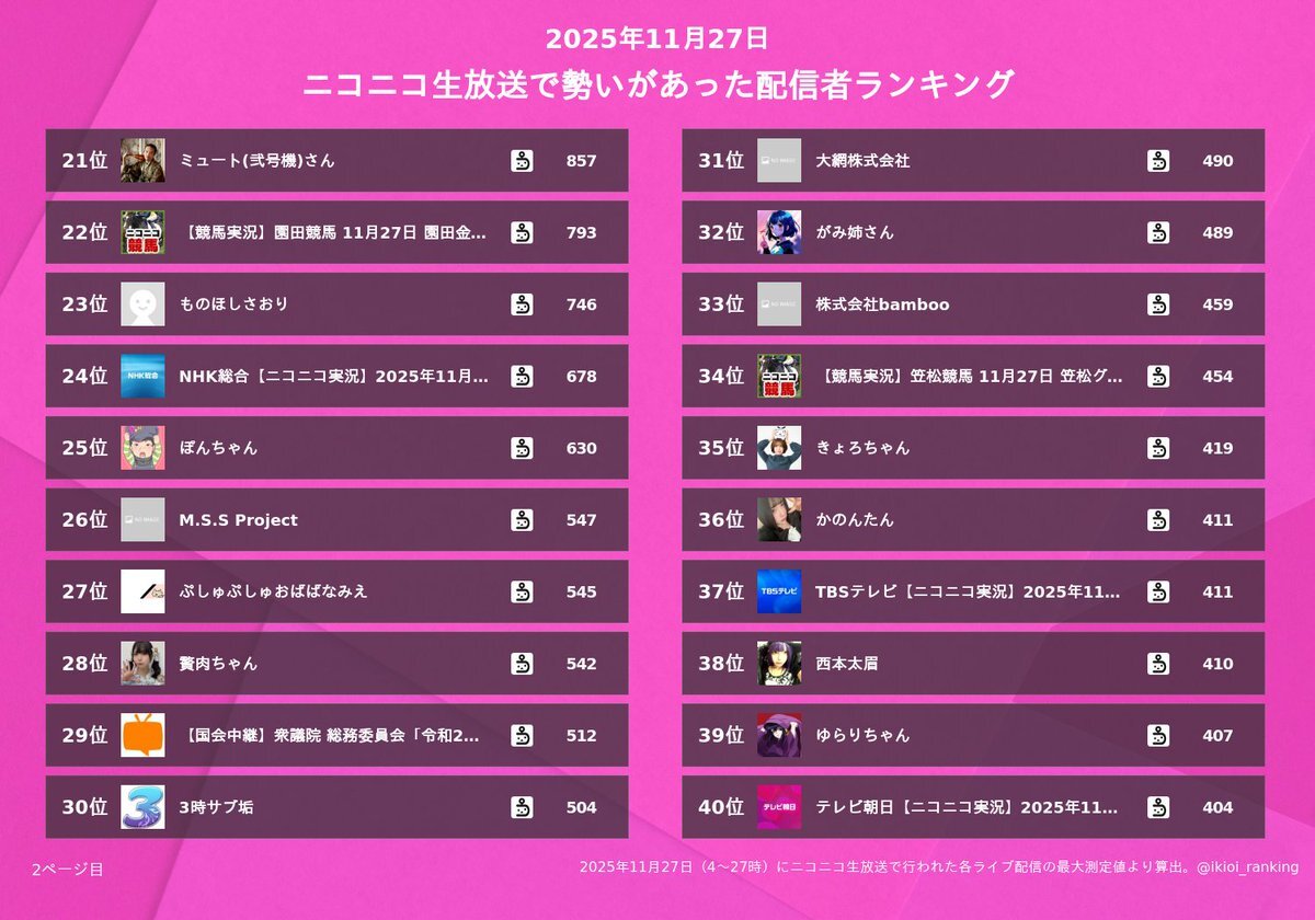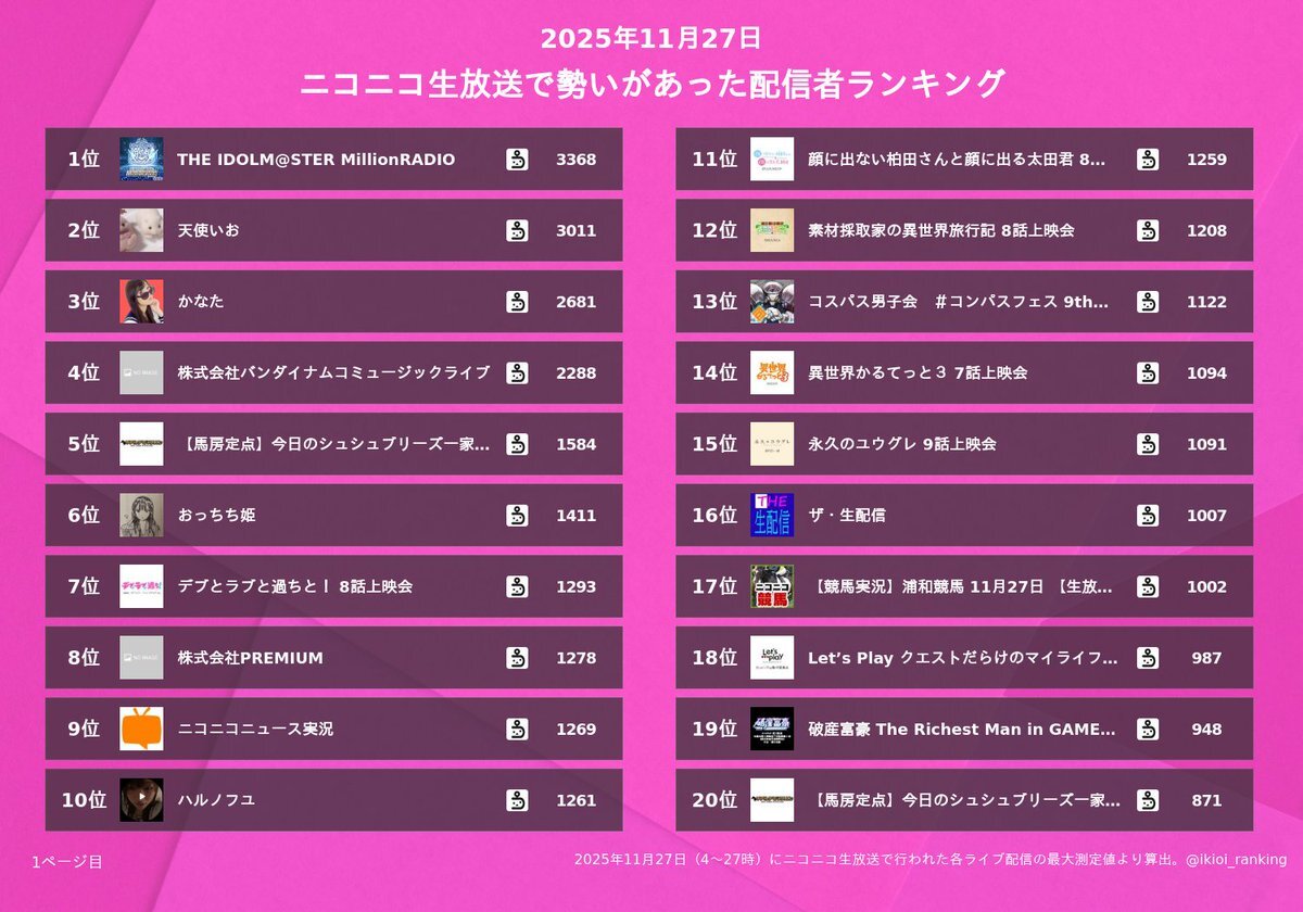 ニコニコ生放送で昨日(11/27)勢いがあった配信者 1位 THE IDOLM@STER MillionRADIO 2位 天使いお 3位 かなた 4位 株式会社バンダイナムコミュージックライブ 5位 【馬房定点】今日のシュシュブリーズ一家 11月27日 6位 おっちち姫 7位 デブとラブと過ちと! 8話上映会 8位 株式会社PREMIUM 9位 pic.x.com/0XeBGJHZJp