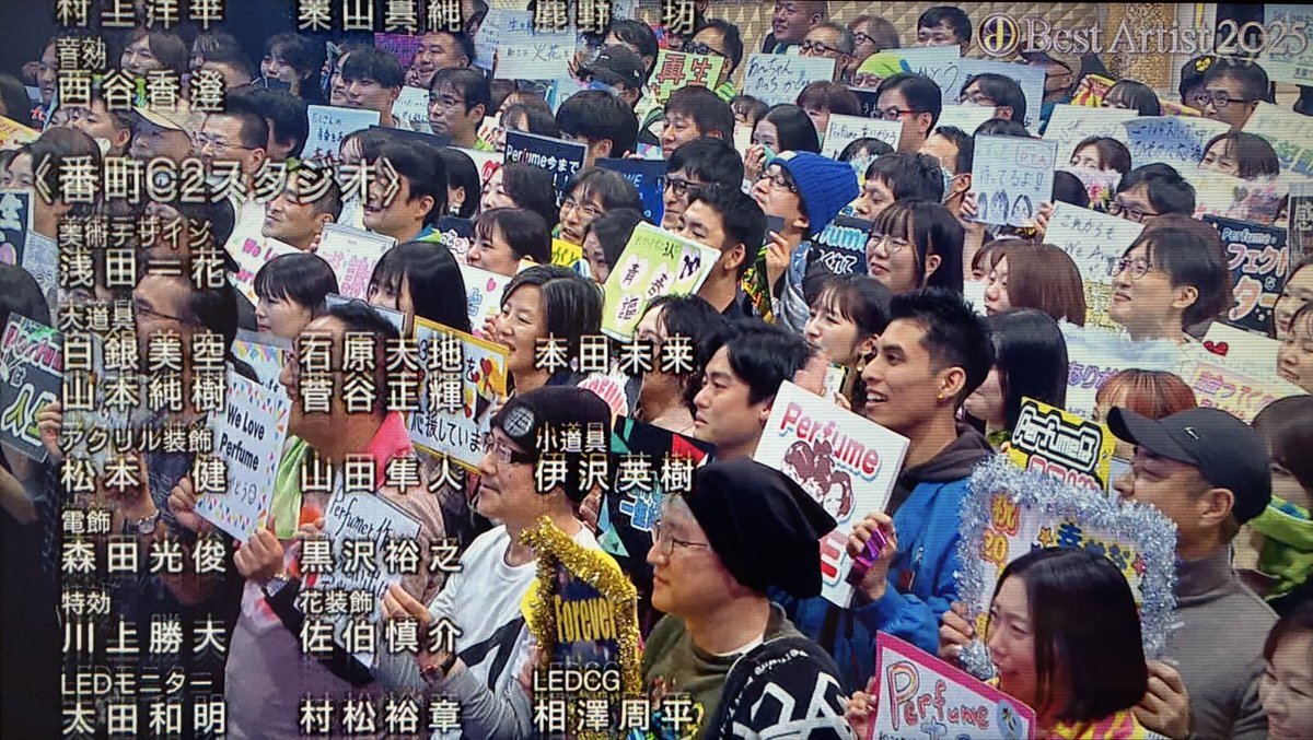 これPerfume出演の観客席のみなさんがファンクラブ会員番号2桁の長年のファンを招待してたそうで、それだけでも最高なのに曲ラストに観客それぞれが想いを書いたフリップを掲げててすごいもらい泣きしてしまった…なんて粋な演出…!観客もPerfumeもどちらも幸せになれる演出〜😭✨愛に満ちてた🥹