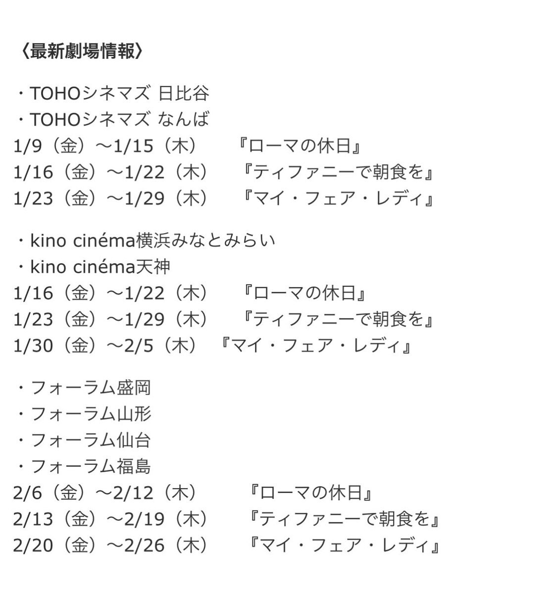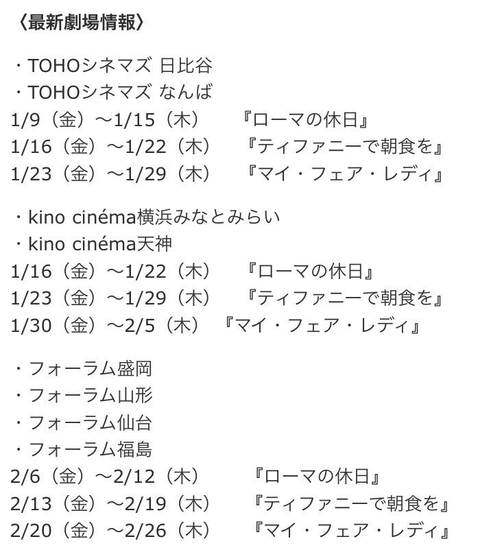 「オードリー・ヘップバーン ~映画史に刻まれた永遠の輝き~」 TOHOシネマズ 日比谷/TOHOシネマズ なんば 2026年1月9日(金)~15日(木)『ローマの休日』 1月16日(金)~22日(木) 『ティファニーで朝食を』 1月23日(金)~29日(木) 『マイ・フェア・レディ』 news.yahoo.co.jp/articles/db204…