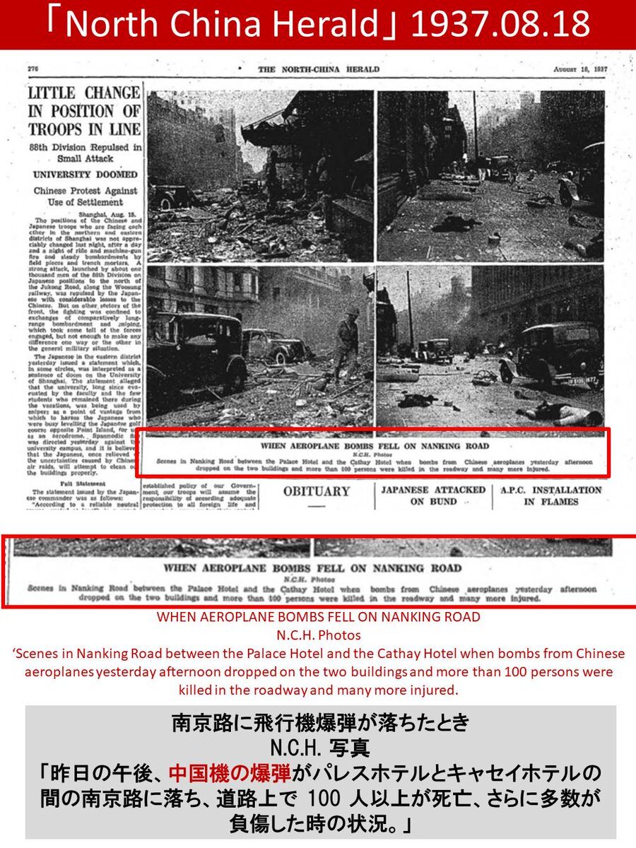 以上のことから、写真は1937年8月14日中国軍機による南京路誤爆事件時の写真と判断する。 ✅「North China Herald」1937.08.18 「昨日の午後、中国機の爆弾がパレスホテルとキャセイホテルの間の南京路に落ち、道路上で 100 人以上が死亡、さらに多数が負傷した時の状況」 archive.org/details/north-… pic.x.com/vST7hfPelW