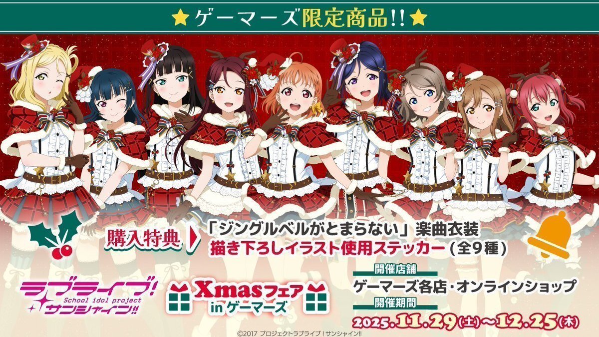 【🎄二次受注のお知らせ🎄】 🟡ゲーマーズ限定🟡 ラブライブ!サンシャイン!! トレーディングハート型缶バッジ ジングルベルがとまらないver. 二次受注受付中❣ 💫受注期間:11月12日(水)~11月24日(月)23:59まで 💫発売日:2026年1月予定 通販はこちら⤵️ gamers.co.jp/pn/pd/10848702/ pic.x.com/EgOxPRDudj
