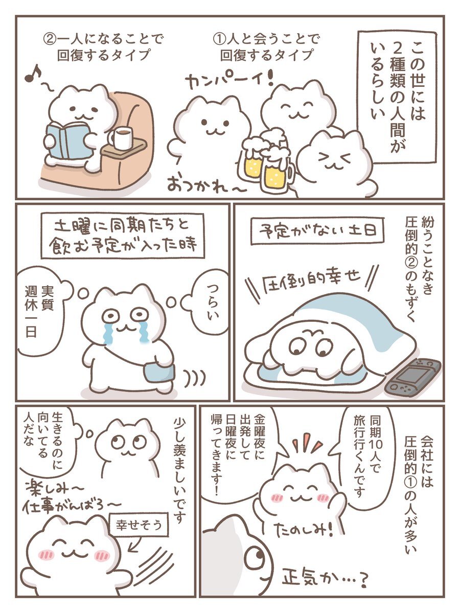 自分も2️⃣というか内向型です。 少人数なら耐えれるけど、 大人数はもはや仕事の延長… 空気読みできるので合わせるけど帰って力尽きるのはお約束。 x.com/mozuku_zqu/sta…