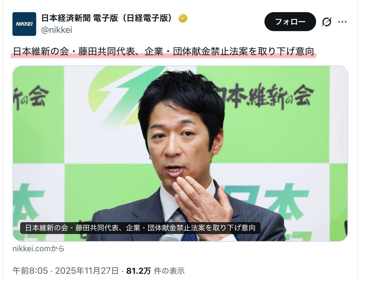 日本維新の会・藤田共同代表、企業・団体献金禁止法案を取り下げ意向 - 日本経済新聞 nikkei.com/article/DGXZQO… 与党になったことでどこかの団体から美味しい献金の申し入れがあったのかな?