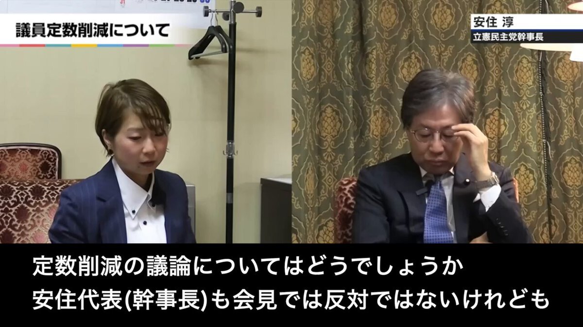 立憲の安住幹事長が議員定数削減について。代議制で議員は行政を監視する役割を果たしており、政治家が嫌いだから削減しろという世論に迎合するのは安易なポピュリズムと発言。削るとしても理不尽な削り方はダメ、自民党も常識的に考えたら何を言ってるんだろうと思っているはずと述べた。