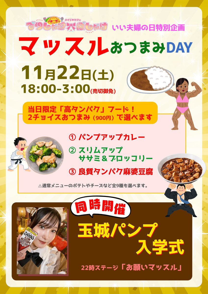 🎉いい夫婦の日特別企画💑 💪マッスルおつまみDAY &🎓玉城パンプ入学式🍀 11/22(土)18-3時 🎤22時入学式ステージ✨ 💪お願いマッスル💪 2チョイスで選べる当日限定おつまみ🍽️ 🍛パンプアップカレー 🥦スリムアップササミ&ブロッコリー 🔥良質タンパク麻婆豆腐 通常メニューもあるよ💖