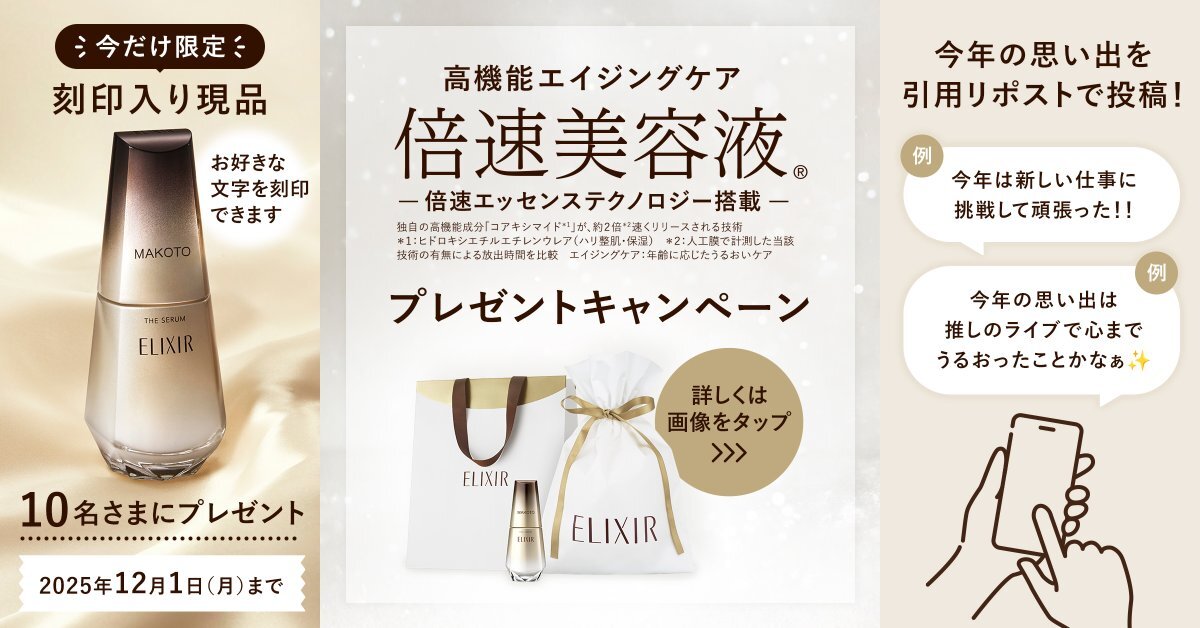 一年頑張った肌に、一足早いクリスマスプレゼント! お好きな文字を刻印した倍速美容液を10名さまに。 さらに500名さまにミニボトルが当たる! 応募方法 ①@elixir_TWをフォロー ②本投稿を引用リポストし今年の思い出を投稿 ③ツリー投稿の応募フォームに入力