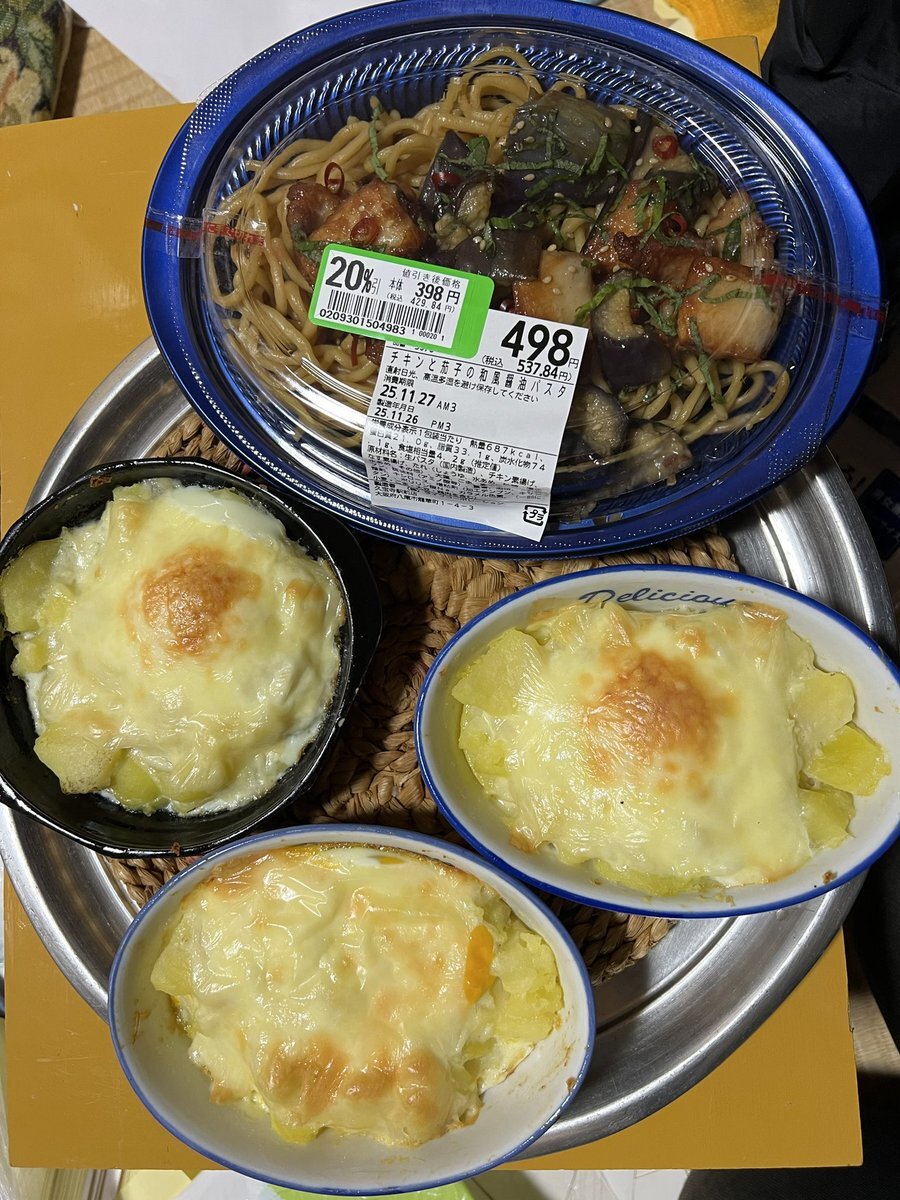 ライフ20%off チキンと茄子の和風醤油パスタ🍆→茄子に釣られた 味付けが甘く無くて良かったししそも嬉しい チンしてたら茄子?が爆発した音にビビって途中でやめたら加熱不十分な麺がほぐれなかったがスーパー惣菜にしてはええ方 ジャガイモとたまごチーズでチン 2回目 pic.x.com/qpDizHc8np