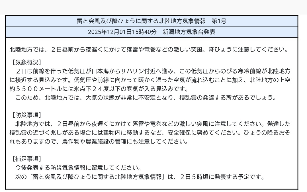 北陸地方 気象情報 2025年12月01日 15:40】 北陸地方では、2日昼前から夜遅くにかけて落雷や竜巻などの激しい突風、降ひょうに注意してください。