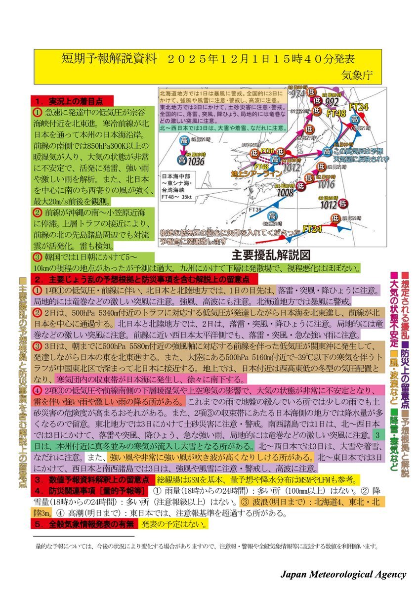 ■短期予報解説資料12月01日15:40気象庁 1項①の低気圧・前線に伴い ■北日本・北陸地方は1日の目先は落雷・突風・降雹に注意/ 局地的には竜巻など激しい突風に注意 強風・高波にも注意 北海道地方は暴風に警戒 2日は500hPa 5340m付近のトラフに対応する低気圧が発達しながら日本海を北東進 前線が北 pic.x.com/6EYbJ6MpiN