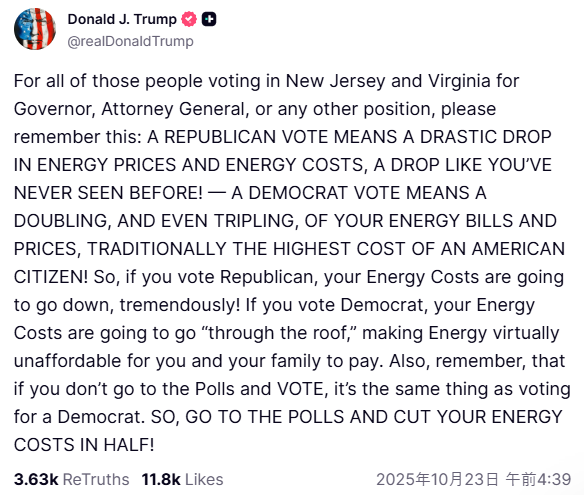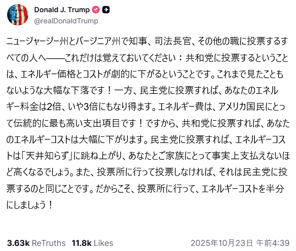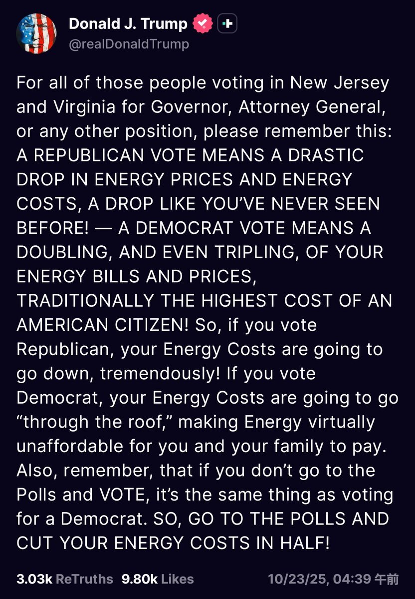 #トランプ大統領 がソーシャルメディアで新しい投稿をしました ニュージャージー州やバージニア州で知事、司法長官、その他の役職に投票される皆様へ、どうか以下のことをお忘れなく:共和党に投票することは、エネルギー価格とコストが劇的に下がることを意味します。