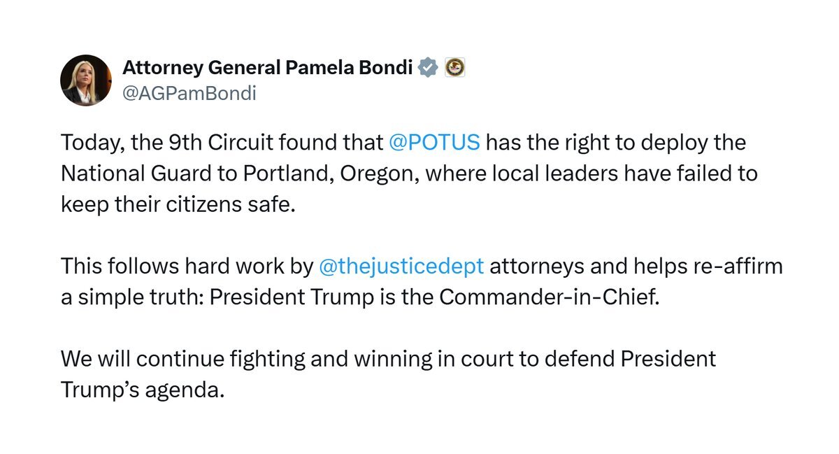 パメラ・ボンディ司法長官 # © @AGPamBondi 本日、第9巡回区控訴裁判所は、@POTUS(大統領)がオレゴン州ポートランドに州兵を派遣する権利を有すると判断した。同地では地元指導者が市民の安全を確保できていない。 これは司法省の弁護士たちの懸命な努力によるものであり、一つの単純な真実を改めて x.com/papitrumpo/sta…