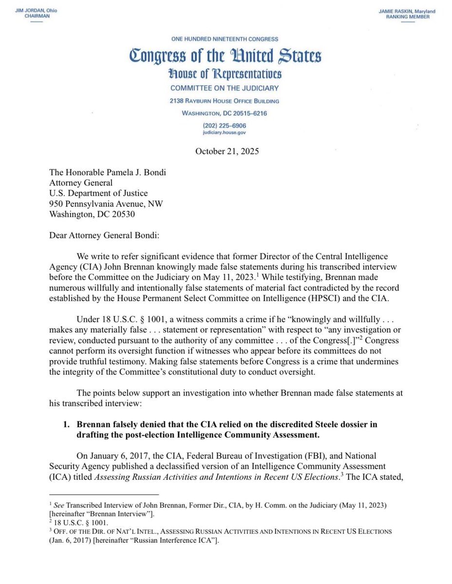 ⇅参照:元CIA長官ジョン・ブレナンが議会に対して嘘をついたとして、司法省に刑事訴追のために正式に送致されました: 2025年10月21日付でアメリカ合衆国下院司法委員会が司法長官パメラ・J・ボンディ氏に宛てた文書  こちら⬇️ x.com/bennyjohnson/s…
