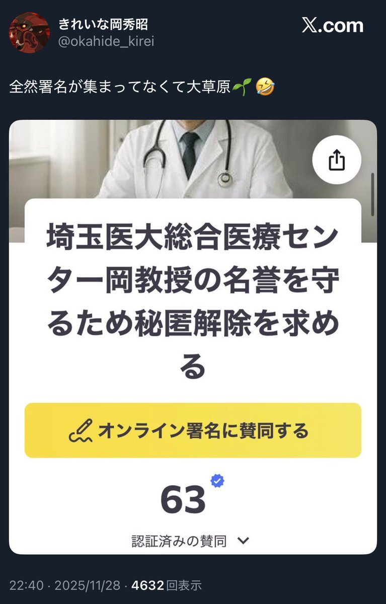お陰様で500名を超え、600名も目の前です。 他人の名前を使い、大学教授の名誉を傷つけた「自称・被害者の会」メンバーが悪質だと認知されてきたのでしょう。 開示請求対策+秘匿での控訴は、裁判所の心証も悪く、秘匿請求の見直しに署名が少しでも役に立てば目標は達成します。 ▼署名はこちら pic.x.com/KGbELUIIpU x.com/okahide_kirei/…
