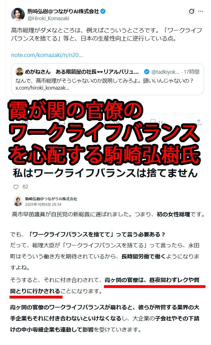 【悲報】 認定NPO法人フローレンス等会長の駒崎弘樹さん ❑「高市総理がダメなところは、…『ワークライフバランスを捨てる等と発言したこと』とX上にポスト ❑#私はワークライフバランスは捨てません と題したnoteに「霞ヶ関の官僚は、昼夜問わずレクや質問とりに行かされる」と記載 x.com/NEWMAN_DAI/sta…