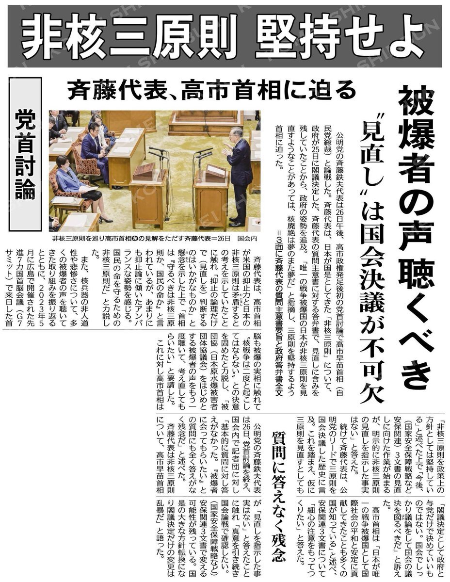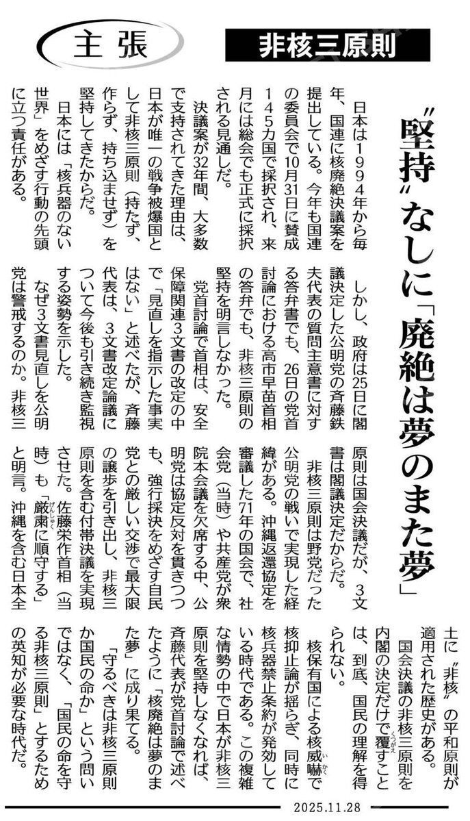 ●公明党が野党時代に実現した非核三原則!世界唯一の被爆国としての矜持!!斉藤代表の党首討論で、高市首相は将来に渡るその堅持を明言せず。国会決議の非核三原則を内閣の決定だけで (主張)非核三原則/“堅持”なしに「廃絶は夢のまた夢」 #公明新聞電子版 11/28付 komei.or.jp/newspaper-app/ pic.x.com/BcKngnyARR