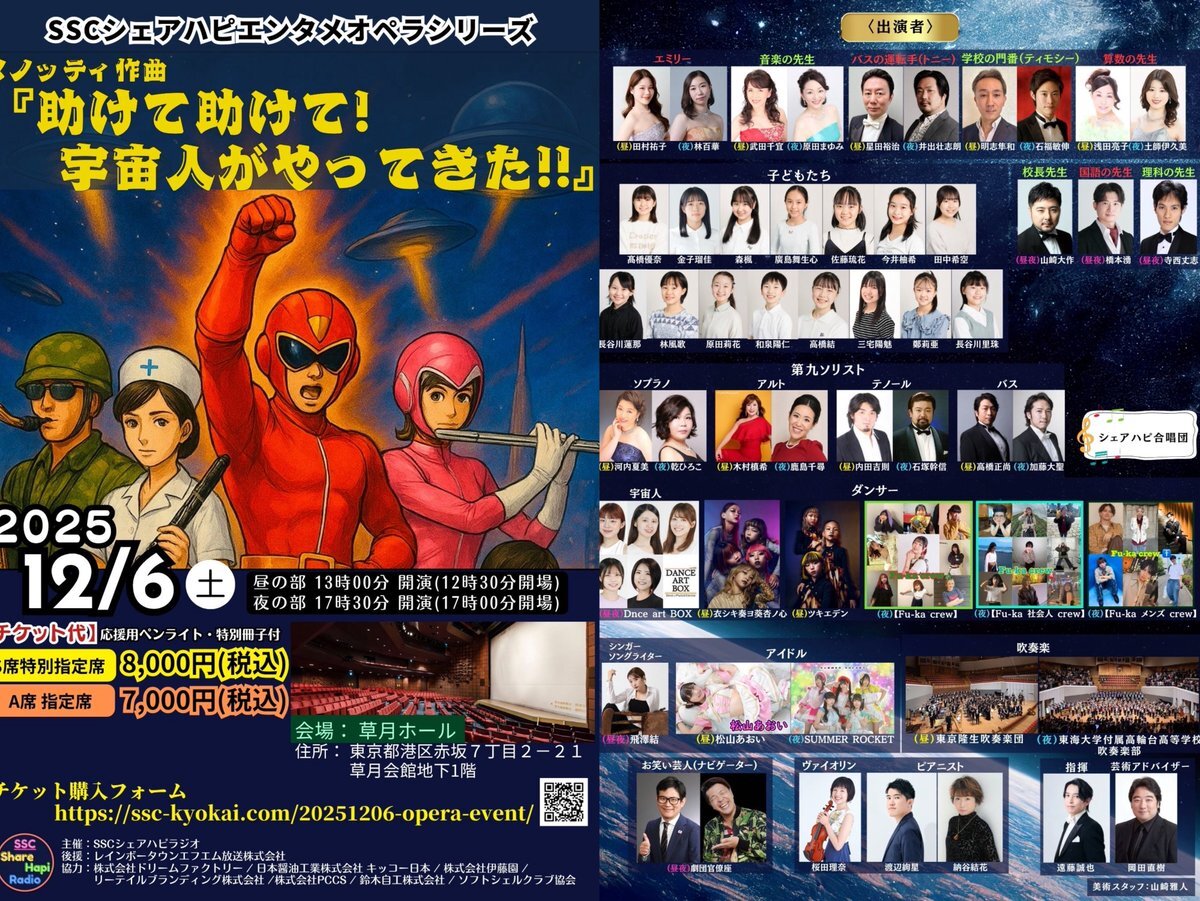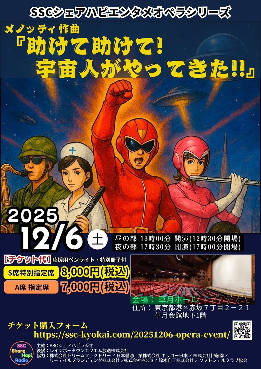 シェアハピエンタメオペラ「助けて助けて!宇宙人がやってきた!!」 2025年12月6日(土) 会場 草月ホール 📮港区赤坂7丁目2-21 開場12:30 開演13:00 ※松山あおいは昼公演のみの出演※ 🎫チケット販売サイト↓ ssc-kyokai.com/20251206-opera… ※備考欄などある場合「松山あおい目当て」の記入お願いします pic.x.com/kDmGkAMtUQ