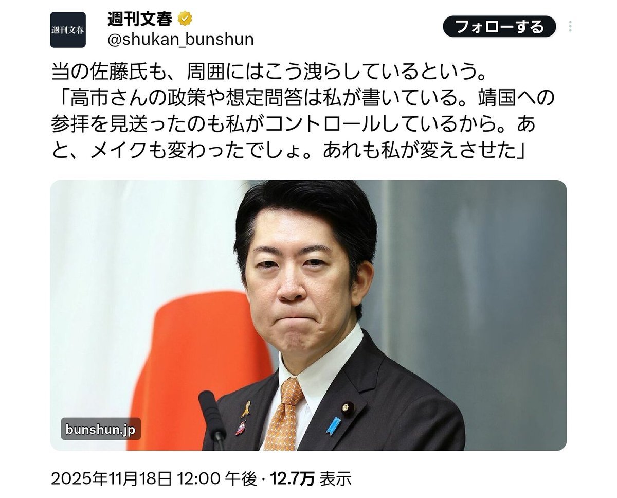 「高市さんのメイクも靖国も私が」佐藤啓・官房副長官の“危ない献金” #週刊文春 bunshun.jp/denshiban/arti… 政策も想定問答集も私が書いてる。靖国への参拝見送ったのも私がコントロールしているから。メイクも私が変えさせた。 ほんなら高市総理なんて佐藤ロボでしかないやんけ。ダッサ😮‍💨