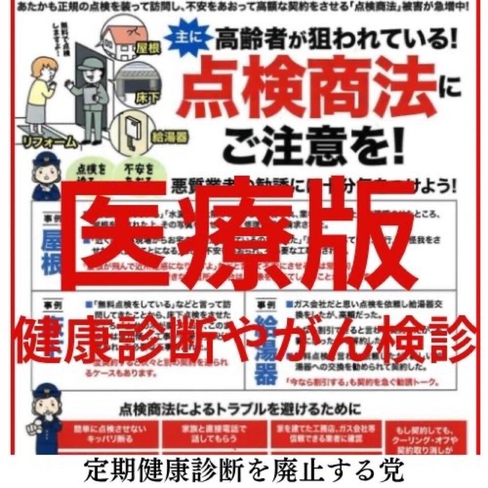 #高齢者が狙われている #点検商法 #催眠商法 >>大借金せおい、・・クリニックは、健診しかいきる道ないから、検査しまくるだろう。 >>病院までいまは、検査、検査、あと入院、手術だから。 健康診断もがん検診も、官民一体の悪徳商法。 pic.x.com/lDGDIOG58w x.com/njshizako1960/…