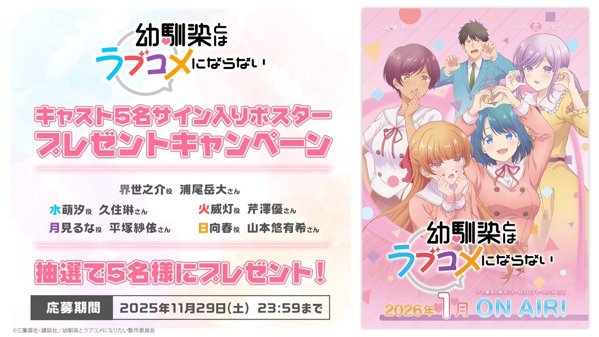 【TVアニメ『#幼馴染とはラブコメにならない』 2026年1月より放送開始🫶】 放送がとても楽しみです・:*+.\(( °ω° ))/.:+ ポスターのイラストがかわいい🩷 個人的には、水萌汐ちゃんが1番可愛い😆👍 #幼ラブアニメ x.com/love_osnnjm_wm…