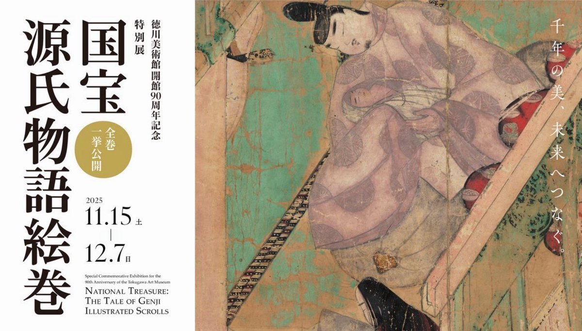 🍁地域の秋の美術展🍁 徳川美術館(名古屋)にて特別展「開館90周年記念 国宝 源氏物語絵巻 全巻一挙公開」(11/15~12/7)が開催されています✨最古の物語絵巻とされる作品で、全巻公開は10年前の開館80周年の展示以来だそうです。尾張徳川家から代々伝わる国宝を鑑賞できるなんて嬉しいですね♪ pic.x.com/RerihmS50B