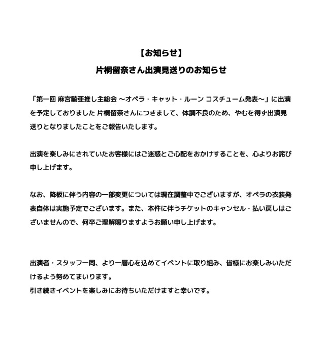 「第一回 麻宮騎亜推し主総会 ~オペラ・キャット・ルーン コスチューム発表~」イベント 【片桐留奈さん出演見送りのお知らせ】 pic.x.com/ifhpfhUJaO
