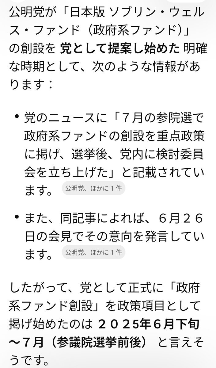 チャッピーに聞いてみました👂 公明党が正式に「政府系ファンド創設」を政策項目として掲げ始めたのは 2025年6月下旬〜7月(参議院選挙前後) との事です。 pic.x.com/nYXcSpFiFG x.com/niconicotako/s…