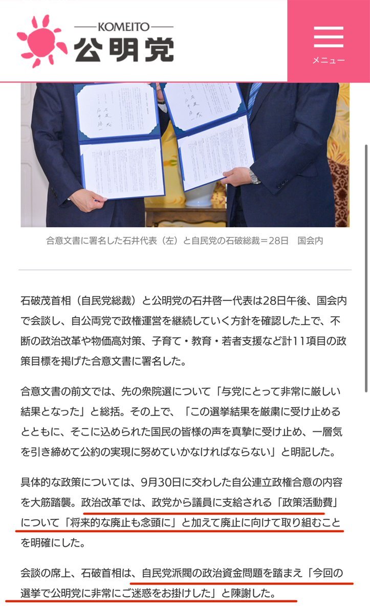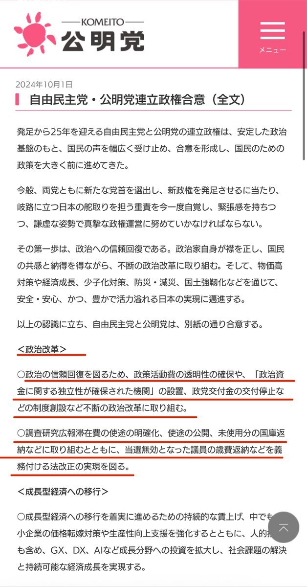 石破政権では政治資金問題視してない問答 いの一番に記載されてる 2024/10/1 合意文書公開 > 政治の信頼回復を図るため、政策活動費の透明性の確保や、「政治資金に関する独立性が確保された機関」の設置、政党交付金の交付停止などの制度創設など不断の政治改革に取り組む komei.or.jp/komeinews/p371… pic.x.com/GujOXweY4D x.com/freedom_barser…