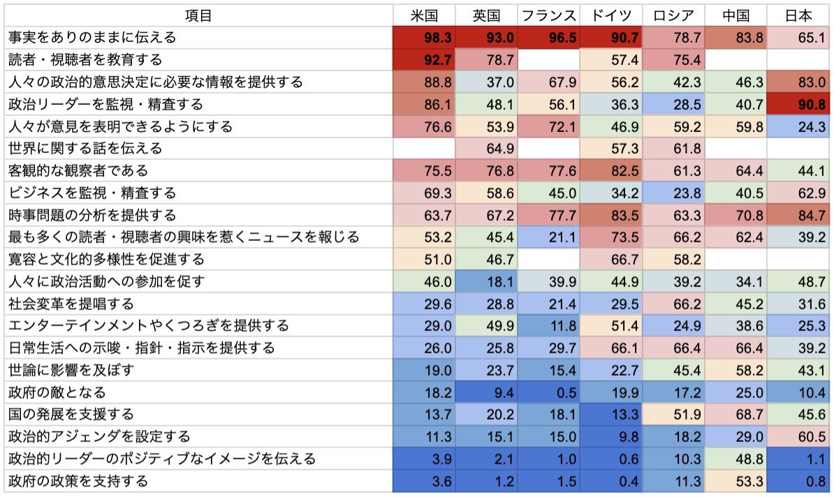 主な国のジャーナリストの回答(自分の仕事の中での各項目の重要性を"extremely important" "very important" と答えたジャーナリストの比率)を並べて色つけしてみた。 それぞれのお国柄はあるけど、それにしても日本のジャーナリズムの異様さがいくつか際立ってる x.com/mizloq/status/…