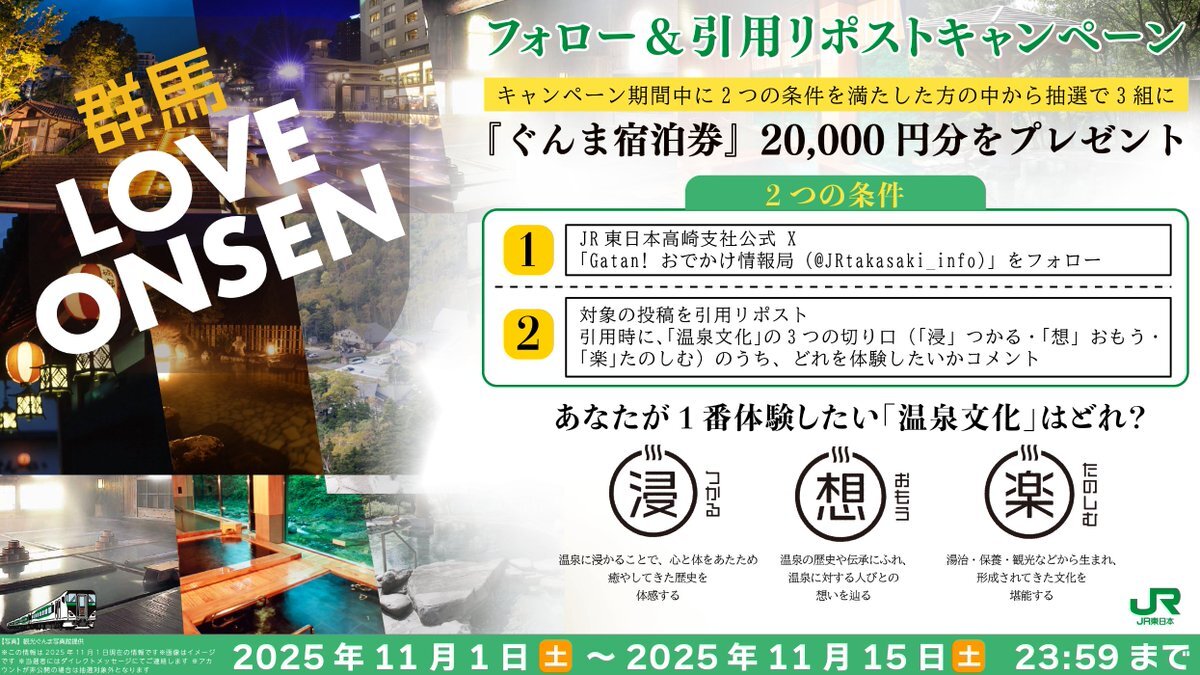 / 群馬の「#温泉文化」を広めたい!フォロー&引用リポストキャンペーン \ 温泉文化を堪能する3つの切り口(「浸」つかる・「想」おもう・「楽」たのしむ)のうち、あなたが一番体験したいのはどれ? ぜひ教えてください♨ 🎁抽選で3組に「ぐんま宿泊券 20,000円分」をプレゼント! ✅参加方法 ①