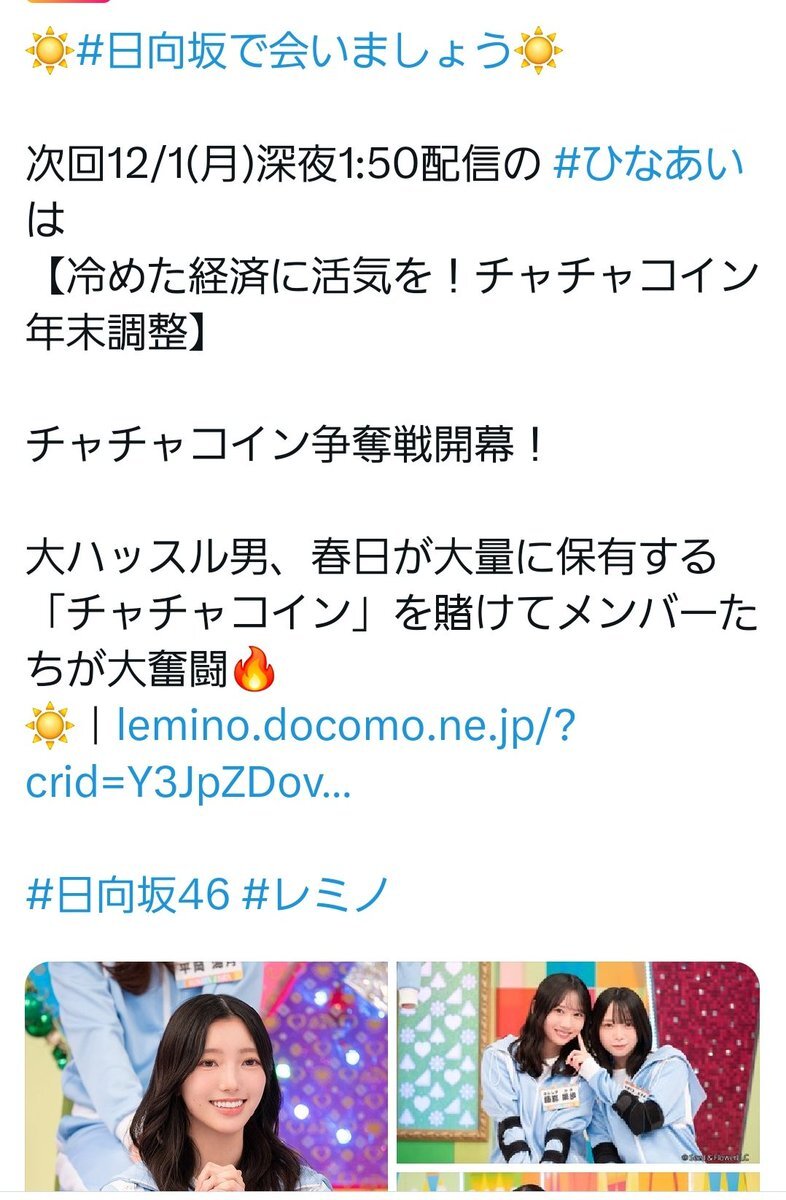 ☀️#日向坂で会いましょう☀️ 次回12/1(月)深夜1:50配信の #ひなあい は 【冷めた経済に活気を!チャチャコイン年末調整】 チャチャコイン争奪戦開幕! 大ハッスル男、春日が大量に保有する「チャチャコイン」を賭けてメンバーたちが大奮闘🔥 ☀️|lemino.docomo.ne.jp/?crid=Y3JpZDov… #日向坂46 #レミノ pic.x.com/QBBCqYCqC2