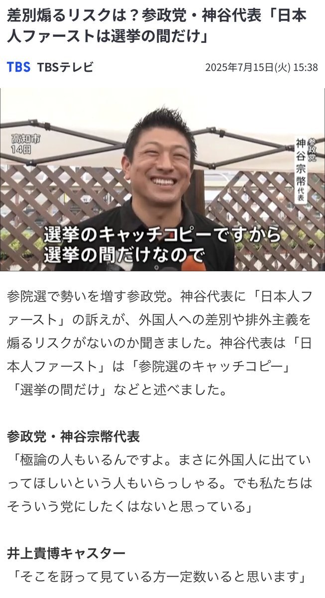 まじか?参政党・神谷代表「日本人ファーストは選挙の間だけnewsdig.tbs.co.jp/articles/-/204…