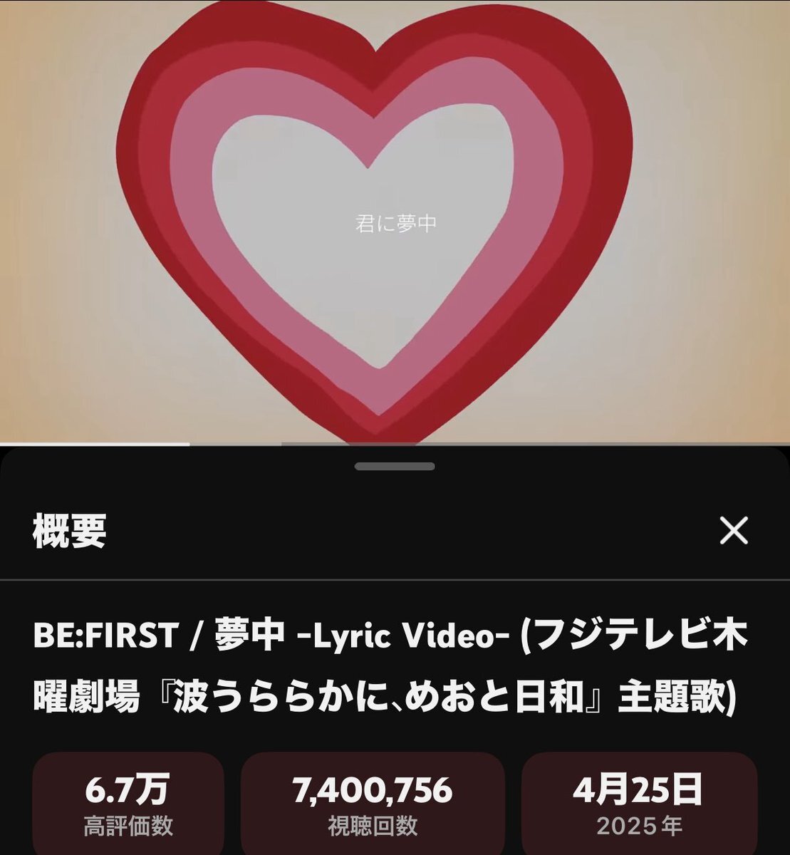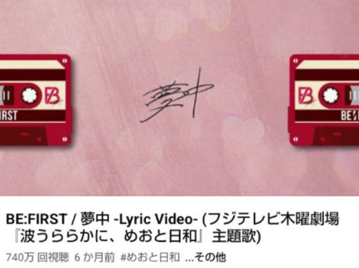 リリックビデオ 740万回再生おめでとうございます youtu.be/FIgDhK_sJDg BE:FIRST / 夢中 -Lyric Video- ドラマ主題歌 フジテレビ系 木曜劇場 『波うららかに、めおと日和』 #BF_夢中 #BEFIRST #めおと日和 pic.x.com/Bt615b8Ke2