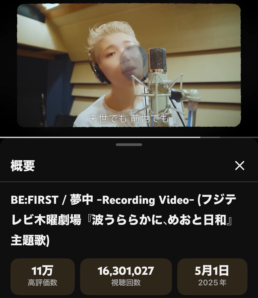 11.15 BE:FIRST / 夢中 -Recording Video- (フジテレビ木曜劇場『波うららかに、めおと日和』主題歌) ❤️ 1,630万回再生おめでとう🎉 youtu.be/TpuNjlGbs6o?si… pic.x.com/psTw9XuUKF