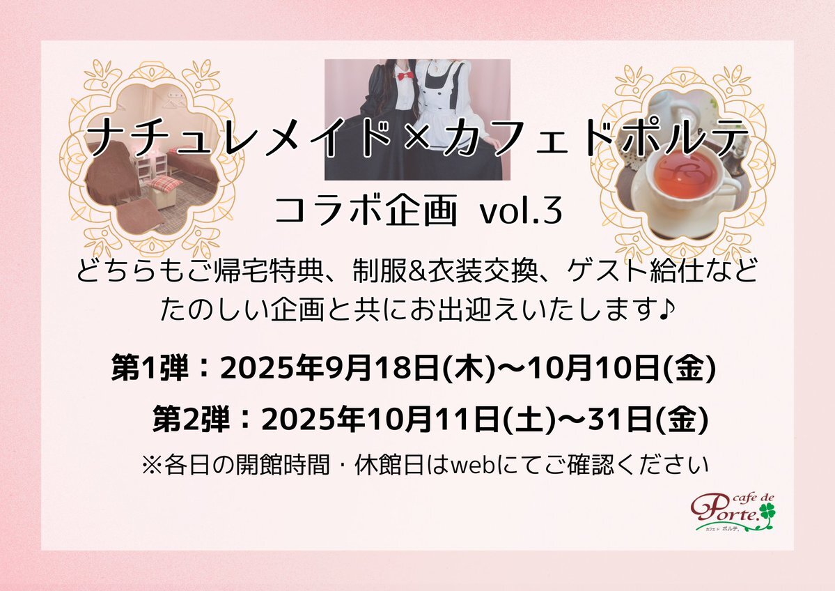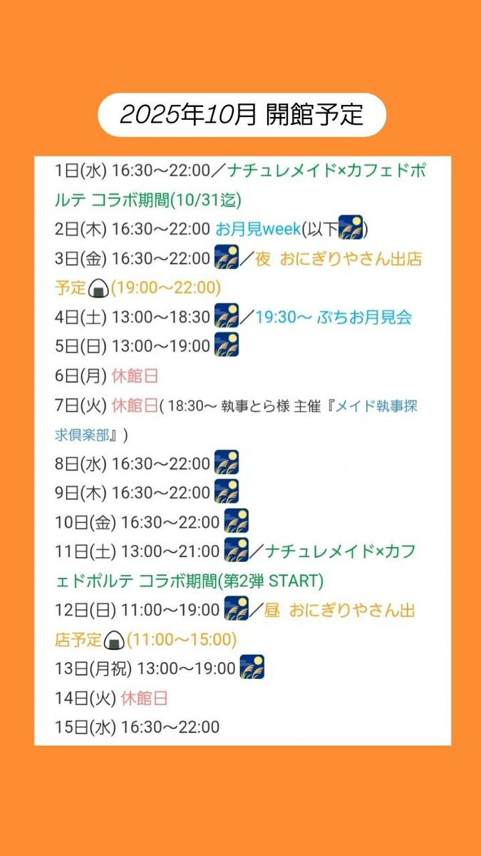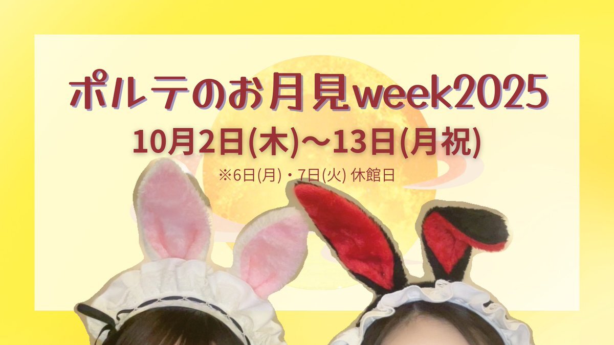 本日もありがとうございました🌃 10月11日(土)は… 🌼ナチュレ(@naturemaid_)×ポルテ🍀コラボ期間 第2弾スタート‼️ 【 OPEN 13:00/CLOSE 21:00 】 お月見weekは10/13(月祝)まで🎑 明日も「 ただいま 」のお声を心よりお待ちしております🏡 pic.x.com/TEWE3tDTAX