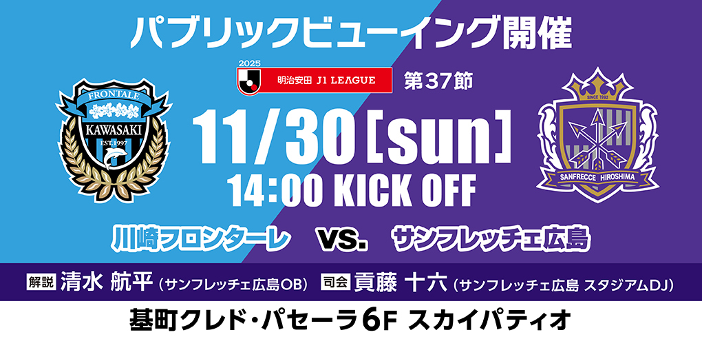 \⚽パブリックビューイング開催⚽/ 明治安田 J1リーグ第37節 川崎フロンターレ vs. サンフレッチェ広島 司会はサンフレッチェ広島 スタジアムDJ 貢藤十六さん、ゲストにサンフレッチェ広島OB 清水航平さんを迎え開催! pacela.jp/sanfrecce-pv20…