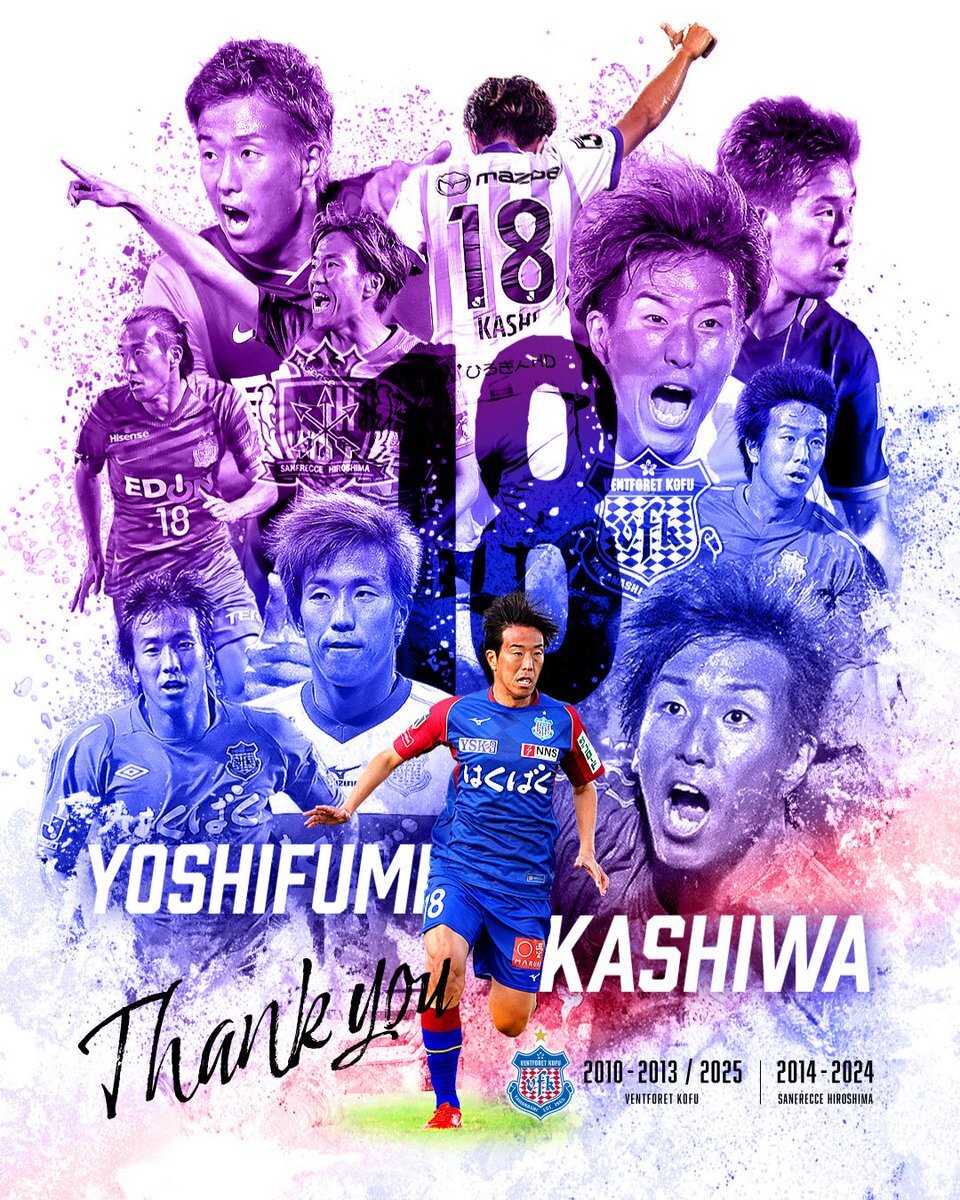 #柏好文 選手 現役引退のお知らせ プロサッカー選手として16年間の現役生活 お疲れ様でした。 辛く長い闘病生活を乗り越え、ピッチに立った柏選手の姿は、多くのファン・サポーター、そして山梨県民に大きな勇気を与えてくれました🔵🔴 『#俺たちのSUPER柏#ヴァンフォーレ甲府 そして pic.x.com/azfUdw4Xqd