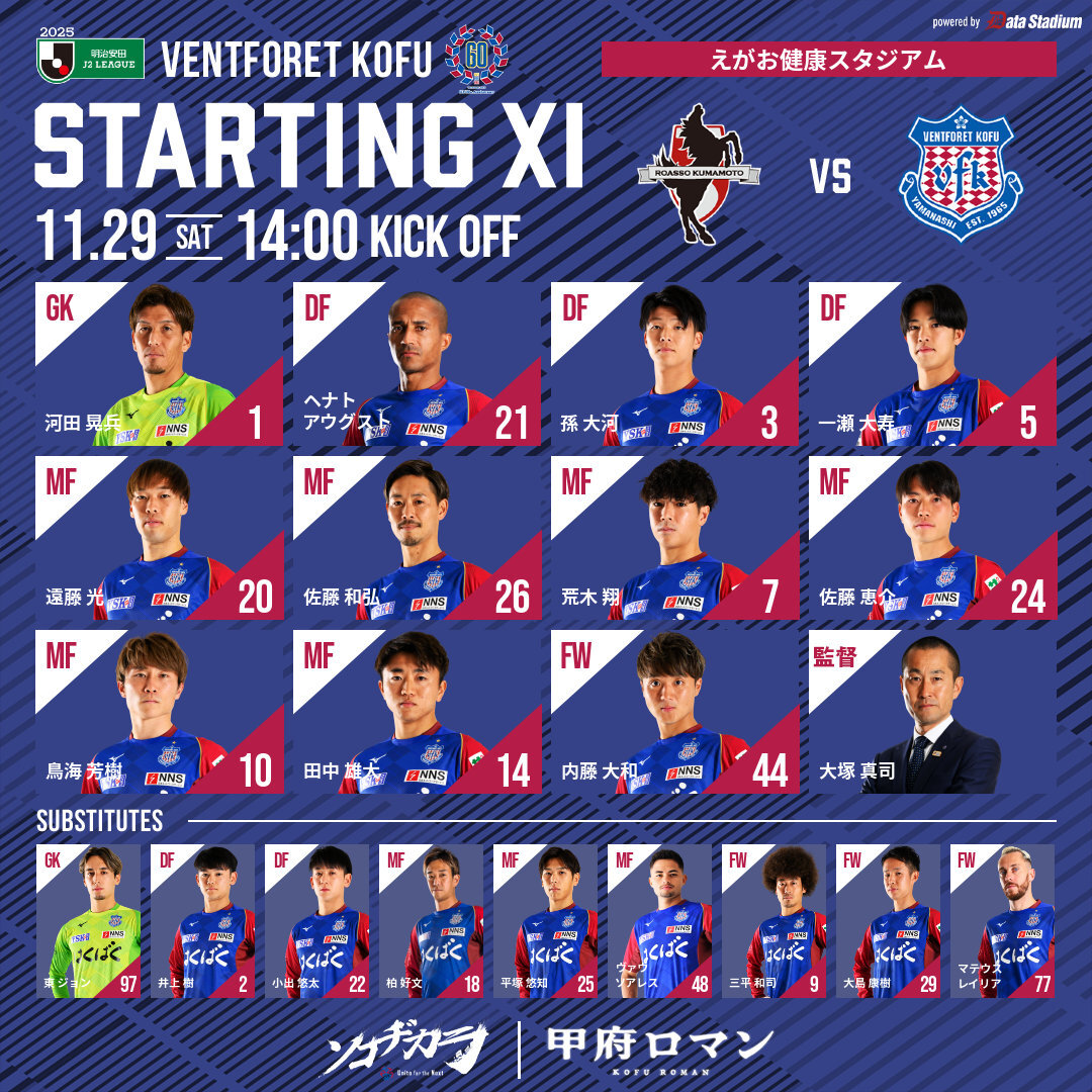 明治安田J2リーグ 第38節 #ロアッソ熊本 🆚 #ヴァンフォーレ甲府 スタメン発表🔥 GK #河田晃兵 DF #ヘナトアウグスト #孫大河 #一瀬大寿 MF #遠藤光 #佐藤和弘 #荒木翔 #佐藤恵介 #鳥海芳樹 #田中雄大 FW #内藤大和 #vfk #ソコヂカラ
