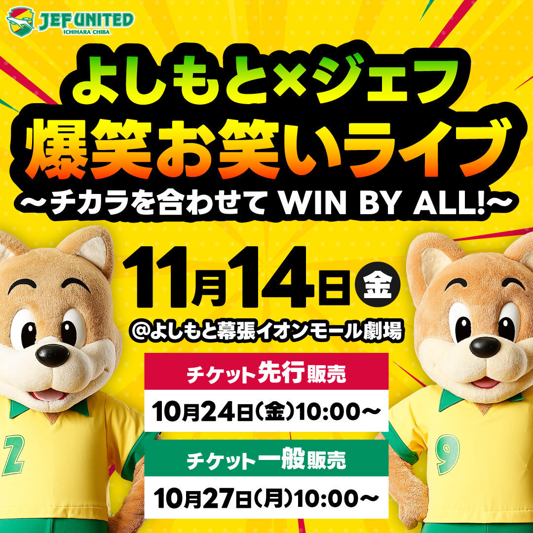 / 11/14よしもとコラボ公演 チケット好評発売中📢 \ 試合のない週末は #よしもと幕張 でジェフ活!🟡🟢🔴 初出しプライベート写真や㊙トークがもりだくさん✨ ご参戦お待ちしております🐶 ⏬出演予定⏬ ⚽ #jefunited 前貴之 選手 岩井琢朗 選手 吉田源太郎 選手 森海渡 選手 イサカゼイン 選手 pic.x.com/NkE7P6DrBd