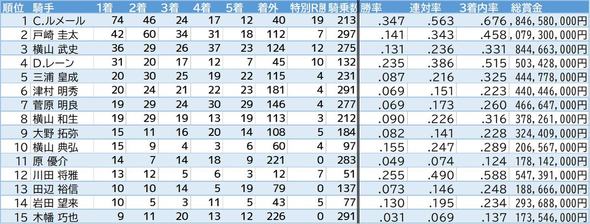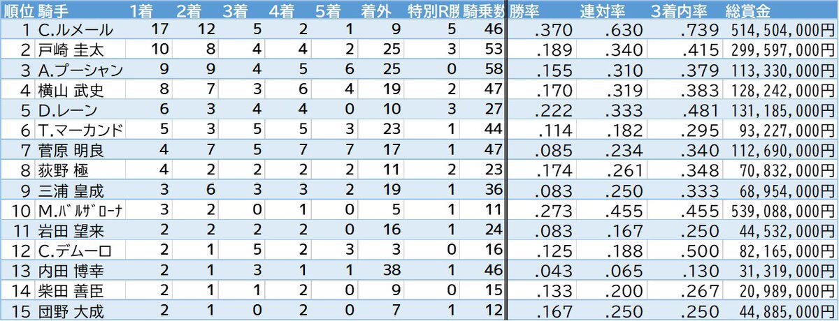 JRAリーディングジョッキー 11/30版 1位 C.ルメール 130勝 2位 戸崎 圭太 123勝 3位 松山 弘平 116勝 4位 横山 武史 105勝 5位 坂井 瑠星 104勝 6位 川田 将雅 101勝 7位 丹内 祐次 89勝 8位 岩田 望来 86勝 9位 佐々木 大輔 77勝 10位 横山 和生 69勝 #騎手 a.r10.to/hY8Bmu
