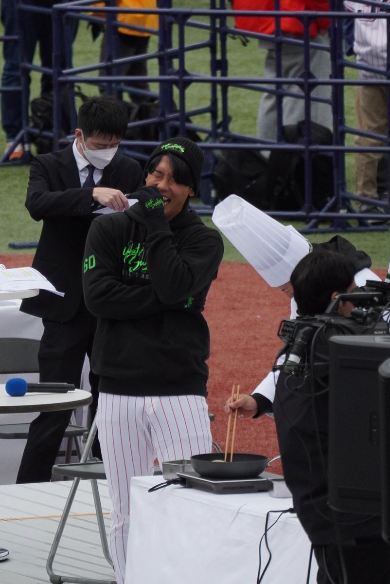 一生懸命取り組む岩田シェフ 偵察に来て爆笑する武岡ファームオーナー 2025/11/23 ファン感 #岩田幸宏 #武岡龍世 pic.x.com/DiXgCVhz5V