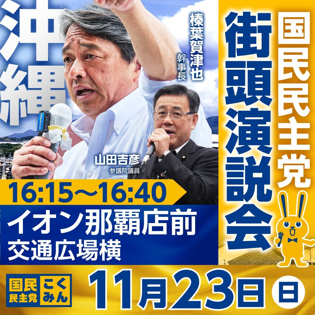 / いよいよ明日‼️ \ 国民民主党街頭演説会 🟡11/23(日)16:15〜16:40 🔵イオン那覇店前 みなさま、ぜひお越しください🙂 お会いできるのを楽しみにしています! #沖縄 #国民民主党 #榛葉賀津也 #山田吉彦 は〜😅緊張する……