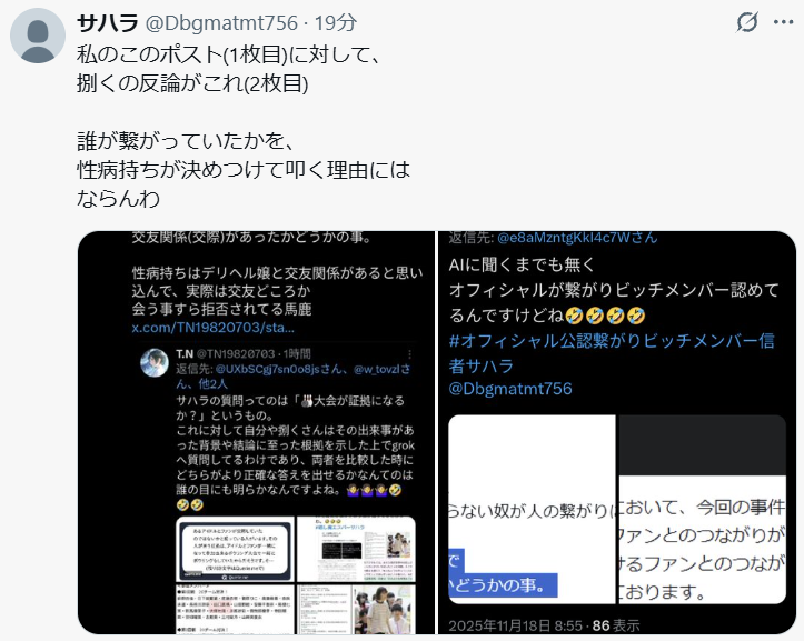 そんなもん当時の研究生が、 活動自粛からの活動辞退になった人がいただろうが?ビッチかどうかは 知らんが。 で、性病持ちが誰かを決めつけて叩く事のおかしさは否定しない訳ね。 長門性病持ち(風俗嬢へストーカー)の様な頭があれな奴と絡みがあるこいつも同類だな。 x.com/w_tovzl/status…