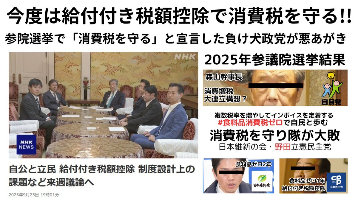 いまの立憲は参院選で「消費税を守る執行部」が完全に否定されたのに、それを反省もせずに、逆に否定された「食料品消費税ゼロか給付付き税額控除で消費税を守り抜ける」と市民を舐め切った政治活動を展開している 野党もきちんと批判を