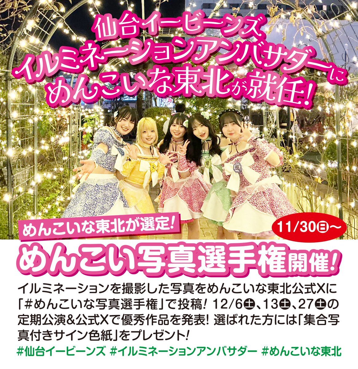 めんこいな東北🩷💛💙💚💜 仙台イービーンズ イルミネーションアンバサダー就任🌈 🗓️11/30(日)より めんこい写真選手権開催📸 #めんこいな写真選手権 ハッシュタグをつけて、イルミネーションのめんこい写真を投稿してください。(人物はありなしどちらでも可、めんこいな東北入りの写真でも可) x.com/menkoina_tohok…