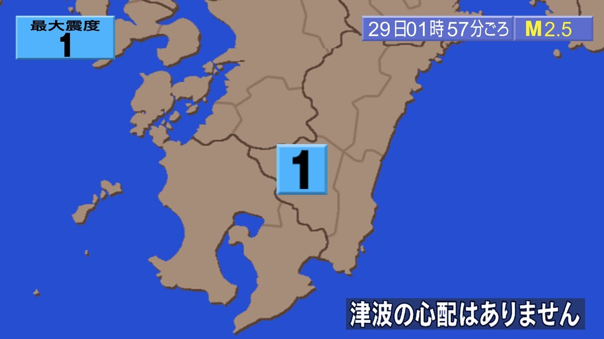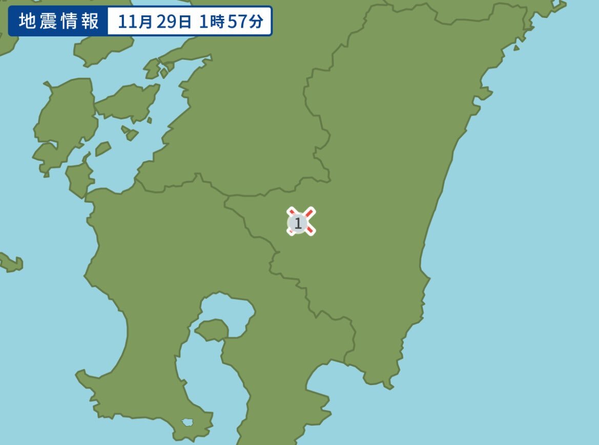 【地震情報】 発生時刻:2025年11月29日01時57分 震源地:宮崎県南部山沿い マグニチュード:2.5 最大震度:1 震源の深さ10km この地震による津波の心配はありません。 #地震 #地震情報 pic.x.com/kAjg6mWh0c