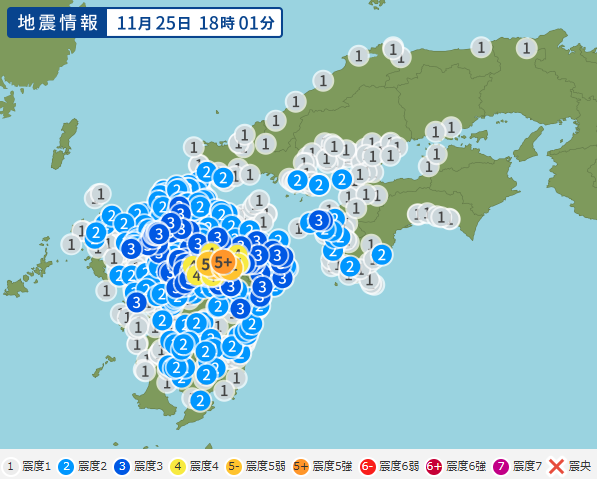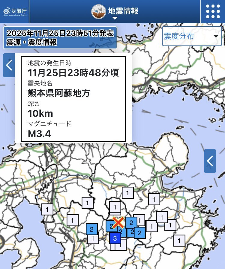 返信先:@okachimachihaka1地震は実際に発生しました。日本気象庁によると、2025年11月25日18時01分頃、熊本県阿蘇地方でM5.7(一部報道で5.8)の地震が起きました。深さ10km、津波の心配なし。